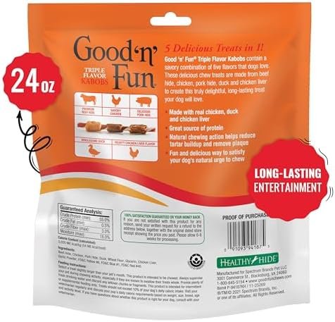 - Premium protein combination: Good ‘n’ Fun Triple Flavor Kabobs feature beef hide, pork hide, real chicken, wholesome duck, and savory chicken liver, making them robust protein dog treats for all dog sizes.