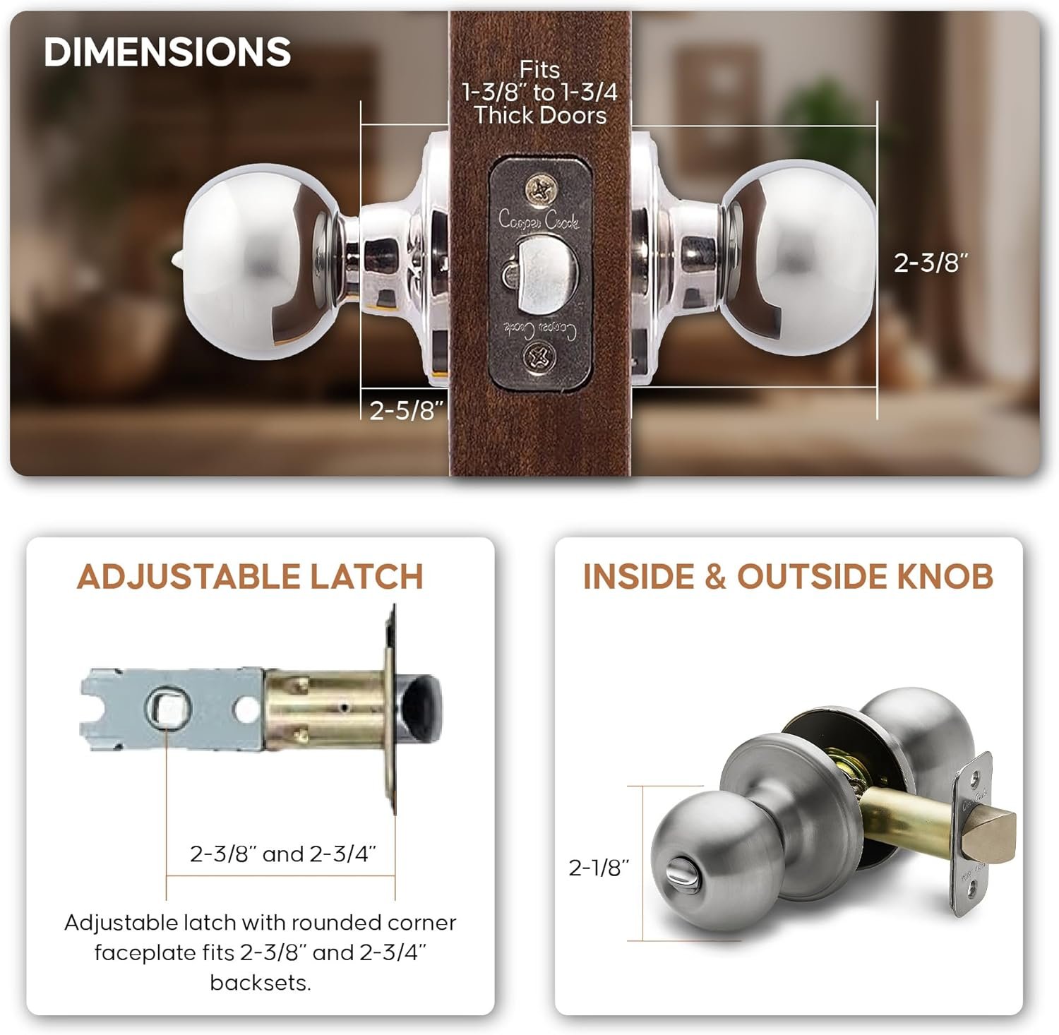 - Easy Installation Every Time: Copper Creek’s design allows for easy installation with just a screwdriver and fits standard door thicknesses (1-3/8″ to 1-3/4″). The included adjustable latch accommodates both 2-3/8″ and 2-3/4″ backsets, perfect for replacing any existing bedroom knob or closet privacy knob.
